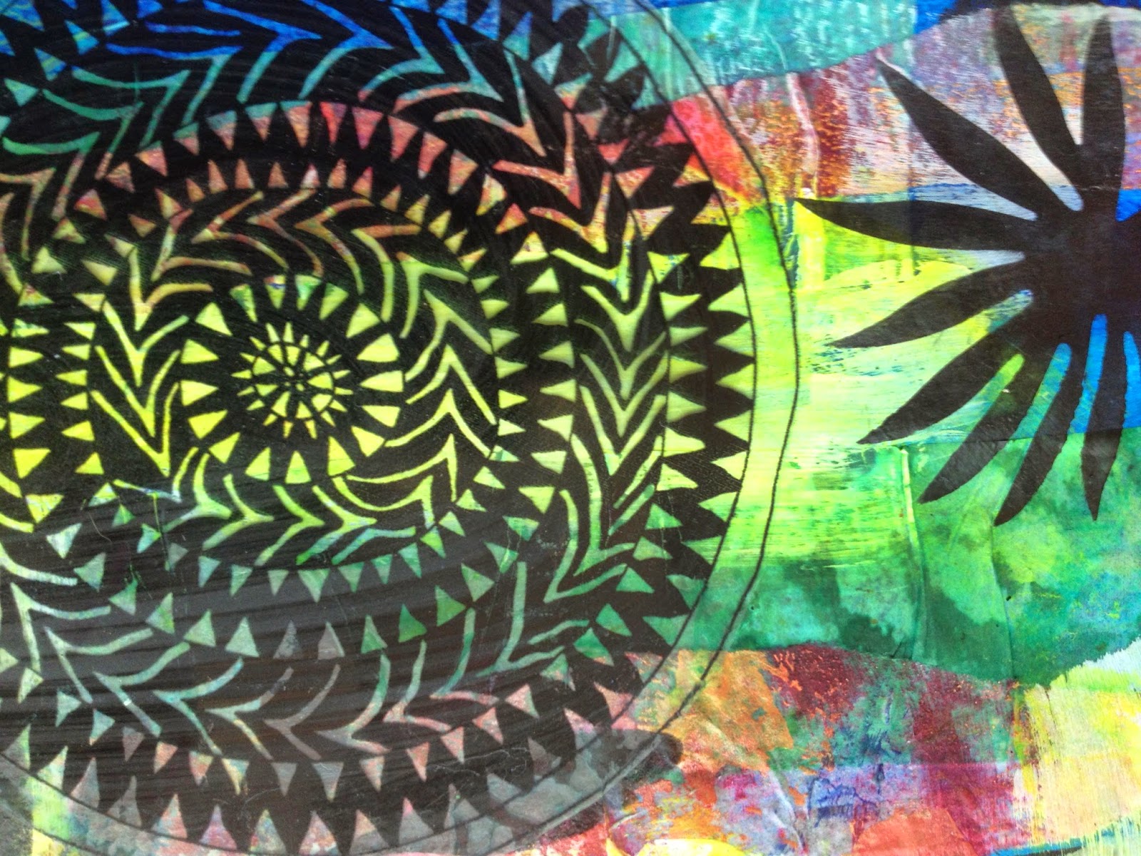 I followed her example by spreading a blue acrylic with the credit card palette knife and stamping number 9 over a gessoed background. For papers to collage I looked through my Gelli stash and found some beautiful multi layered deli papers. Then I went in a new direction. Stamping on the Gelli papers gave me translucent images of tribal masks to cut and glue with gel medium, stenciling with Stazon insured vine images would adhere to the background. My clip art collection of West African images provided the round graphic which I printed on transparency.